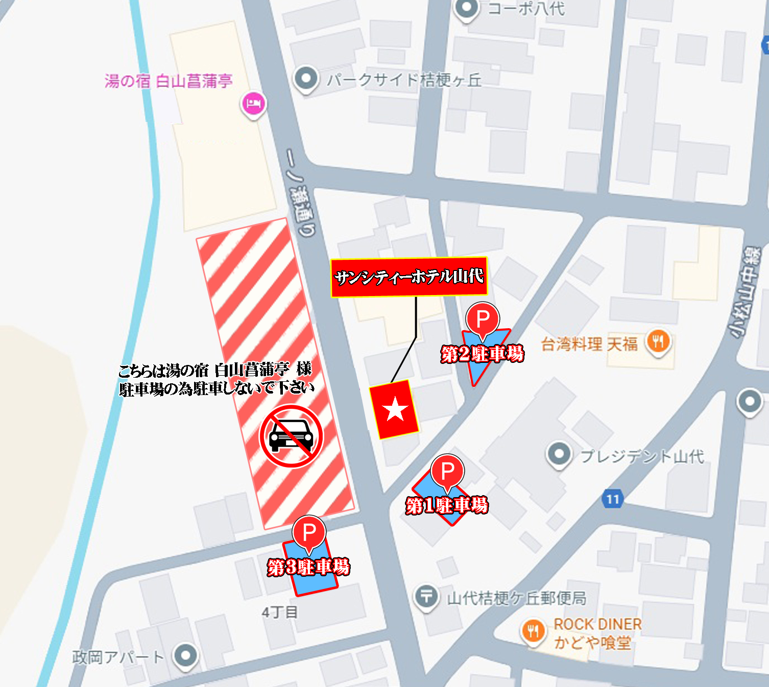♦駐車場のご案内♦ 収容台数 ・第1駐車場 9台 ・第2駐車場 8台 ・第3駐車場 10台又は大型バス、トラック等駐車可 ・当館入口前に駐車場案内看板有 ※お向かいの白山菖蒲亭様駐車場には駐車しないでください